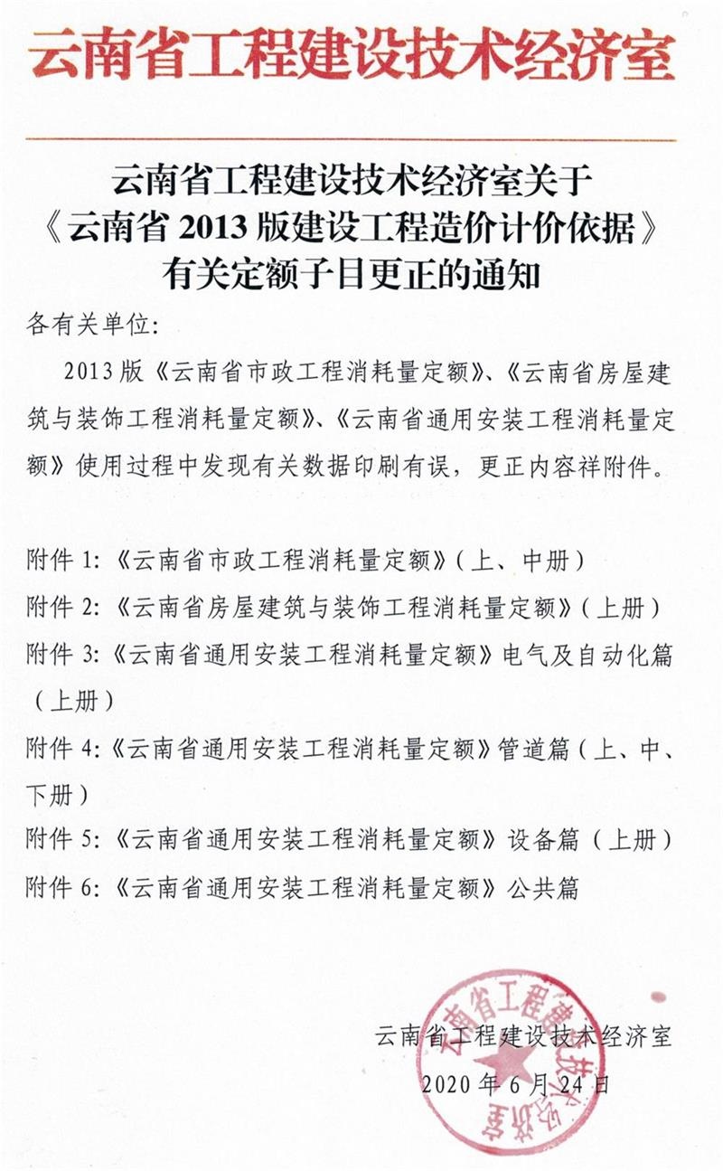 关于《云南省2013版建设工程造价计价依据》有关定额子目更正的通知 | 文档天下-k8凯发娱乐
